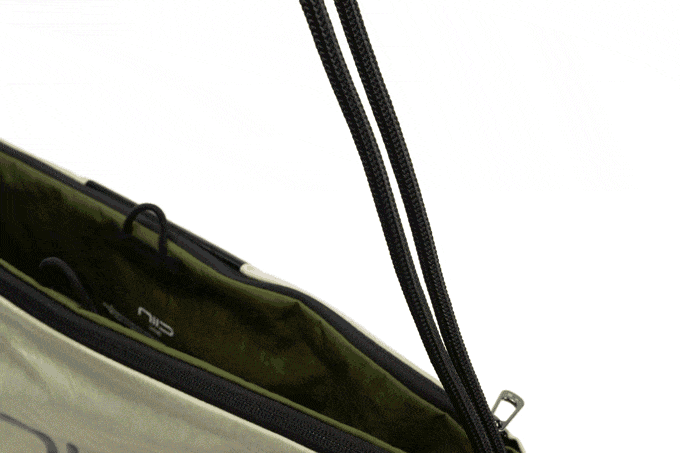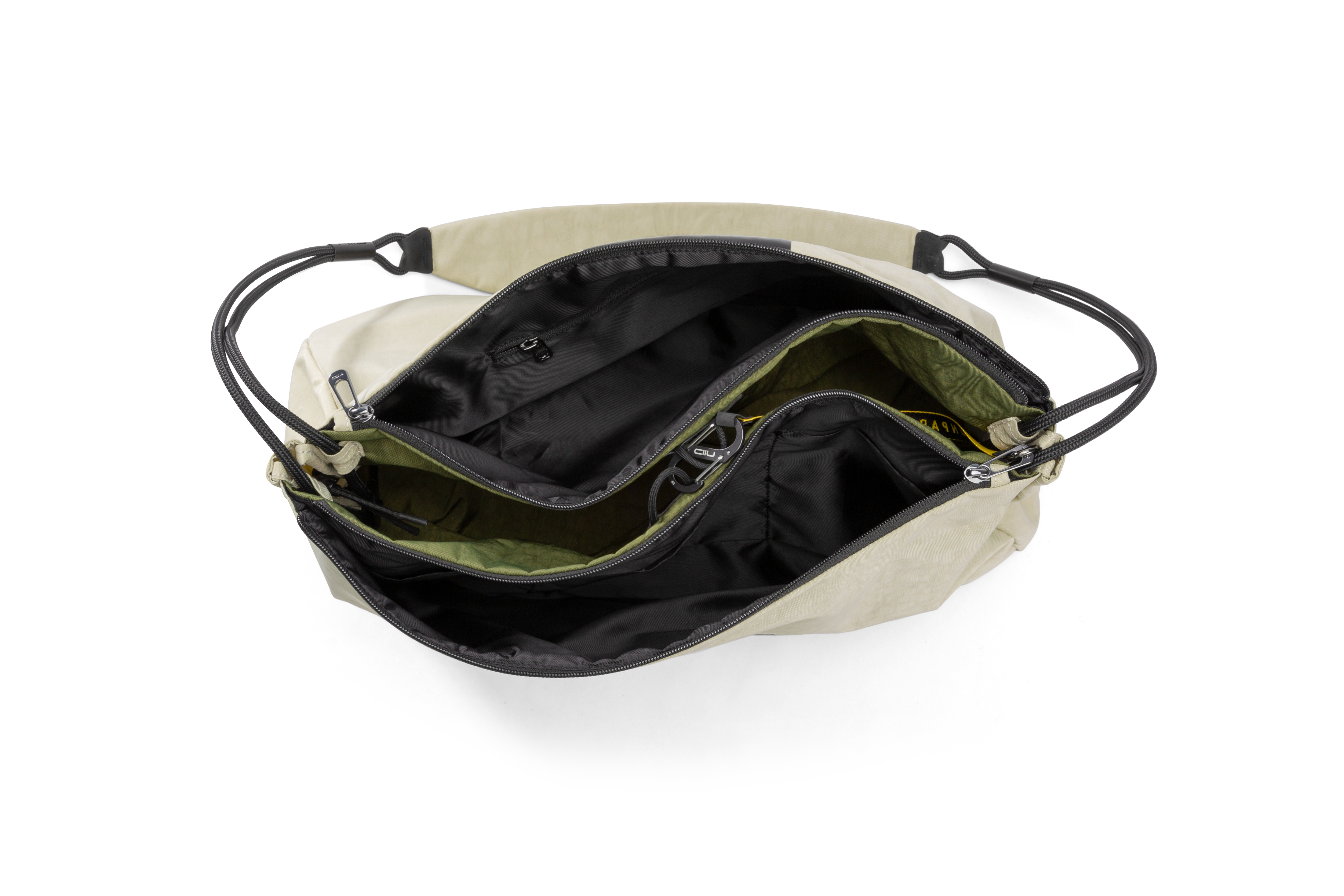 本体両サイドに紐がついていて、絞ればバッグのサイズ感を調整でき、トートバッグからメッセンジャーバッグやホーボーバッグとして使用できるそうだ。