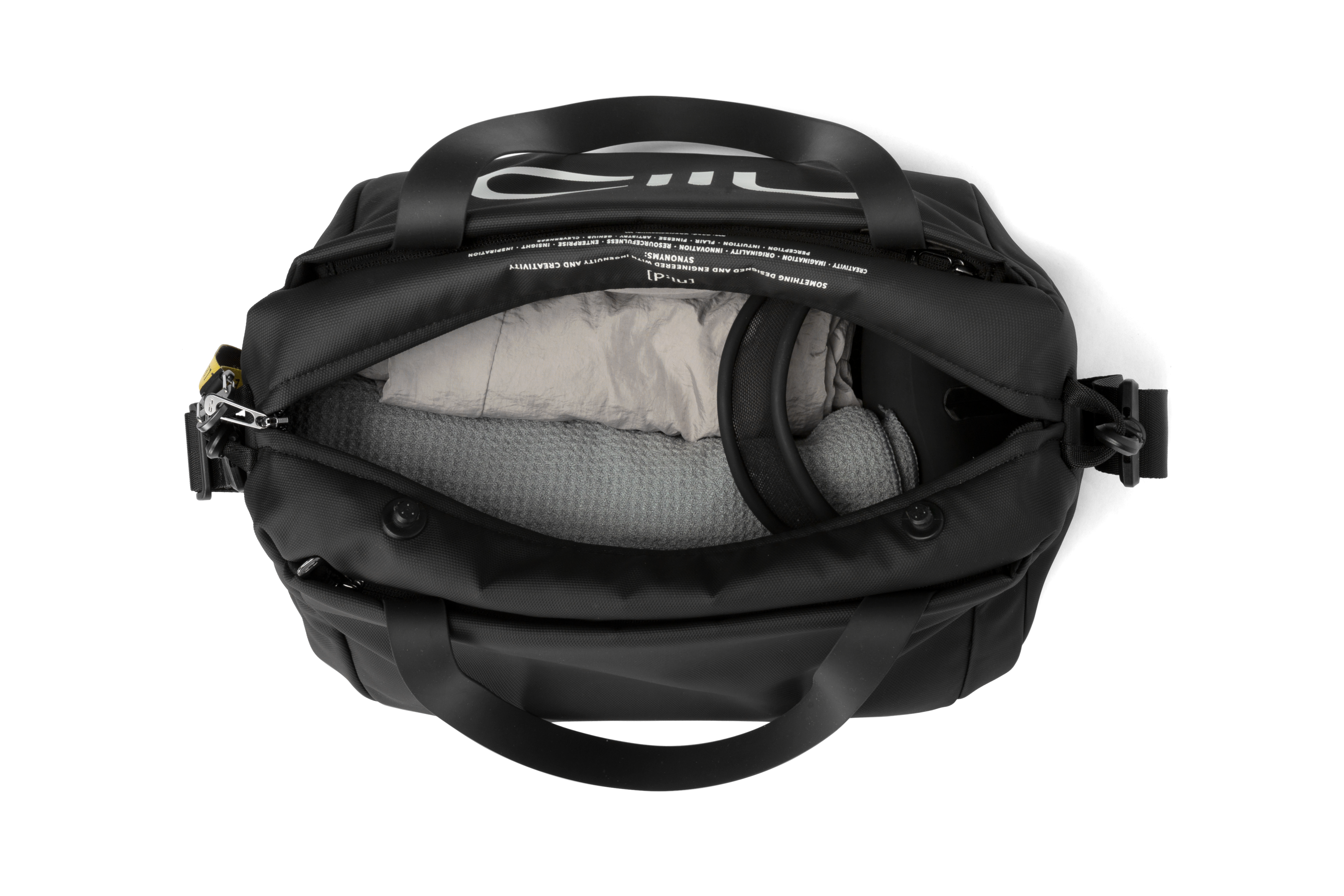 スリングバッグ状態では、水筒などを挟み入れられるそう。ダッフルバッグ状態は格納式ハンドルで手持ちでき、容量も約15Lほど入るようになる。