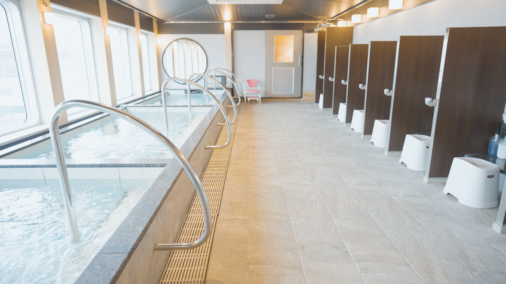 乗客1人当たりの内装面積が従来と比べて大幅に増えたことにより、客室だけでなく大浴場やパブリックスペースも船の中とは思えないほどゆったりとしていて快適だ。