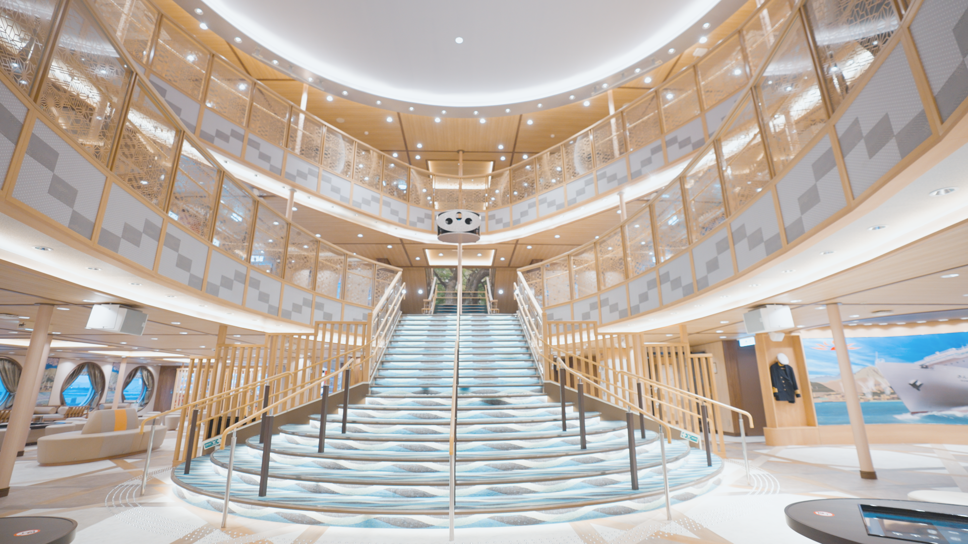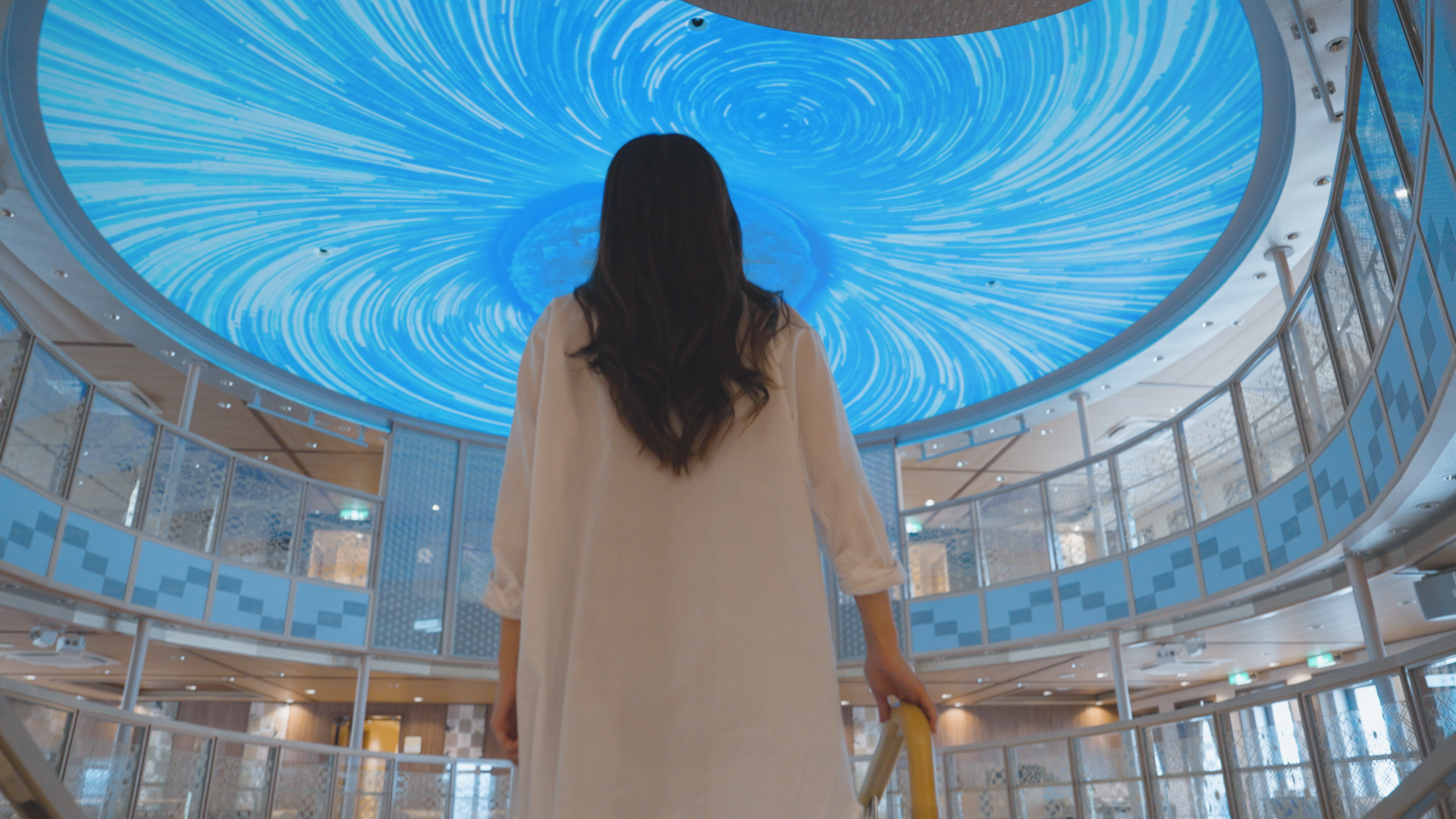 乗船時、まずゲストの目を引くのが3層吹き抜けとなった圧巻のアトリウム。中央の美しい大階段を上れば旅の高揚感も自然と高まる。