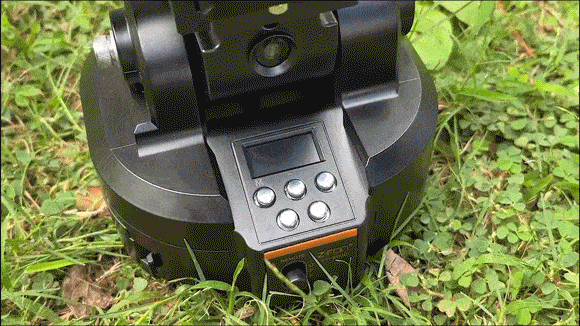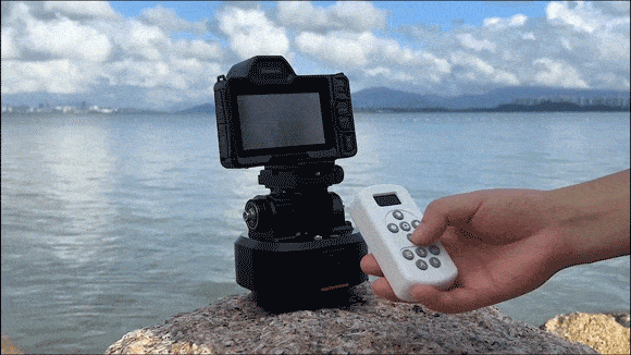 付属のリモコンは最大30m離れた場所から回転方向や速度、シャッター操作を行える。