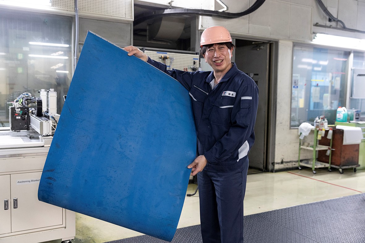 「ブランケットも小さい物ではないので、220枚となると大量になります。これを見ていた私の大先輩が“もう一回使えないかな”と思ったのが、開発の始まりでした」と話してくれたのは、技術センター長の椙原浩史さん。椙原さんいわく、この“熱血の大先輩”はおもしろい人で、なんでも試してみたい人だった。そして、ブランケットの縮みの原因となる布部分に、何か塗るか貼るかをすれば、厚みを復活できるのではないかと思いついた。