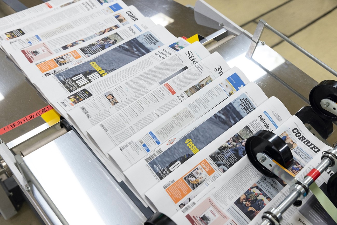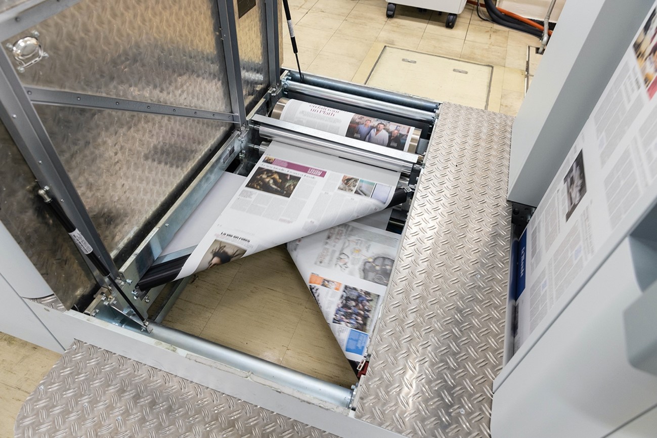 さっそく試し運転をしてもらった。オペレーターが備え付けのコンピューターを操作すると、目では追えない速さで印刷から断裁、折り加工が行われ、あっという間に新聞となって排紙口から出てきた。しかも、次々に違う複数の海外紙が印刷されている。こうした連続して1部1部が異なる印刷(バリアブル印刷)も可能だ。この印刷機を使えば、海外紙など部数の少ない新聞も効率的に印刷することができるという。また複数の海外紙をまとめて配達できるため、輸送面でのCO2削減にも貢献できる。
