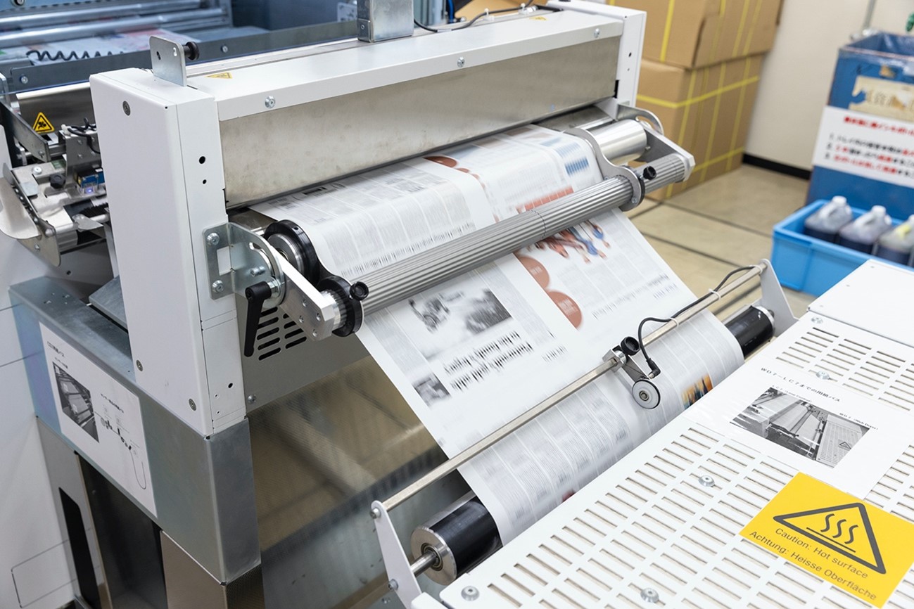 藤波 まず、印刷後の断裁や折り加工などの後加工機を付けている連帳式デジタル印刷機は、珍しいと思います。通常は、印刷したロール状の用紙を印刷機から取り外し、後加工機に付け直す作業が発生しますが、弊社は印刷から製品になるまでがワンストップ。そのぶん時間も手間も短縮できます。また朝日新聞のクオリティーに準拠するプロファイル(色の設定)をしていますので、色の再現力や紙質までも朝日新聞と同じようなイメージでお作りすることができます。
