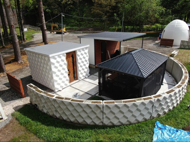 北海道新冠町の太陽の森ディマシオ美術館の中にある「GLAMPING VILLAGE 紅葉の里」という施設が3Dプリンターで作られた国内初のグランピング施設です。この施設は北海道のコンクリートメーカー會澤高圧コンクリートによって建てられました。