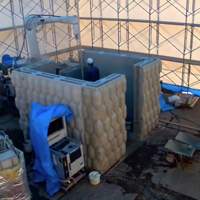 建物の高さは2.6mで、床面積は9.8㎡、各宿泊棟は5~6枚のパーツで構成されており、準備や調整をふくめて1日1~2枚ずつ印刷しているとのこと。この「c3dp」を用いたスピード施工によって省人化と工期短縮を期待できます。