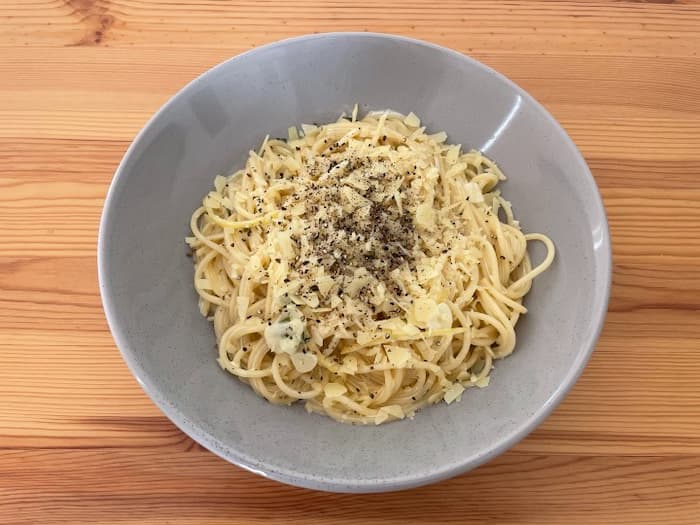 お皿に盛り、たっぷりのパルメザンチーズとコショウを入れて完成です。