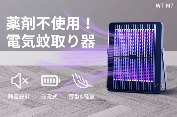「WT-M7」は、UV光源・温度・二酸化炭素の3要素によって蚊などを誘引し、電撃接触面で駆除できるというアイテム。