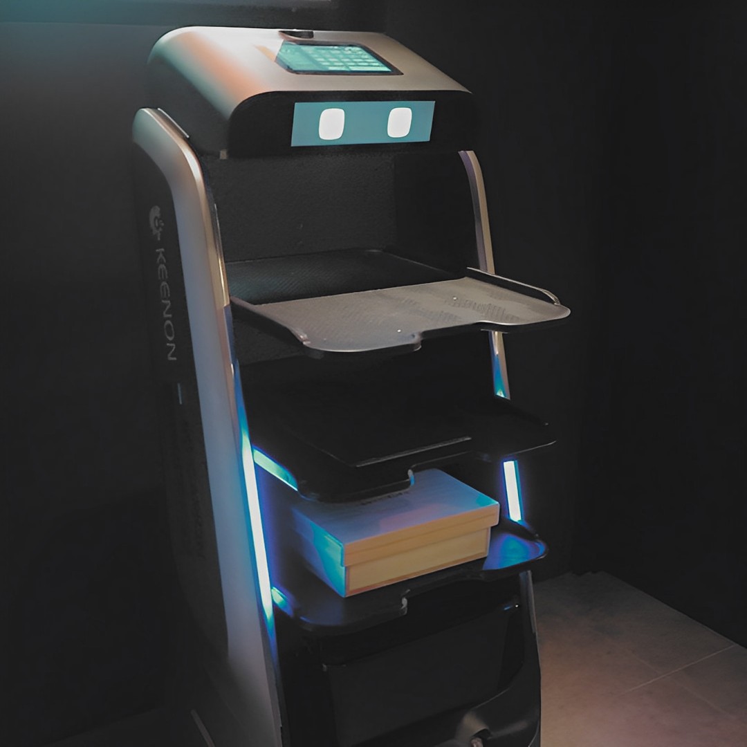 店内では受付のみスタッフが対応し、以降はセルフまたはロボットでの対応により接客を自動化。コストカットを実現しています。