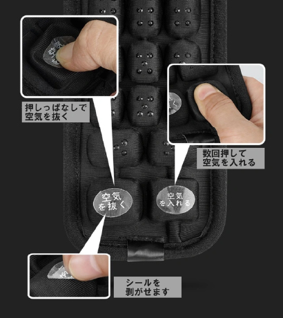 エアセル内部の空気量は、製品の一番下についたボタンを押すことで調整可能。自分の好みに調整でき、長期間使用して空気が抜けた場合でも再度空気を充填して使用できる。
