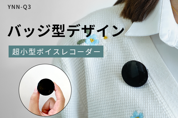 「YNN-Q3」は、8gの軽量で洋服やカバンに装着して録音できるバッジ型の小型ボイスレコーダー。