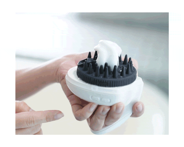 専用のシャンプーを注ぎ口に入れると、きめ細かいもこもこ泡が自動で作られる。3分間の振動機能が頭皮をやさしく刺激するという。シリコンブラシは2種類あり、好みの硬さを選べる。防水規格はIPX7だ。また、赤色LEDを備え頭皮に照射できる。