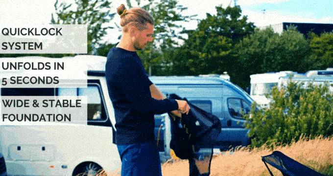 1-piece portable chair | 5-second unfold | 1.45Kg/3.3lbs | 300lbs capacity | Alu-frame | Embracing seat | 12" seating height