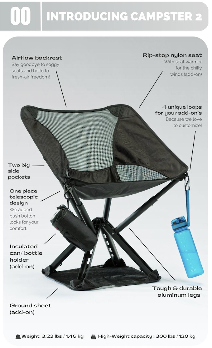 「Campster 2」は脚とシートが一体構造。複雑な組み立て不要で、開けばすぐに使える直感的なデザインになっている。折りたたみ時は1.5Lペットボトルほどのサイズで持ち運びが容易。アウトドアでは活躍しそう。