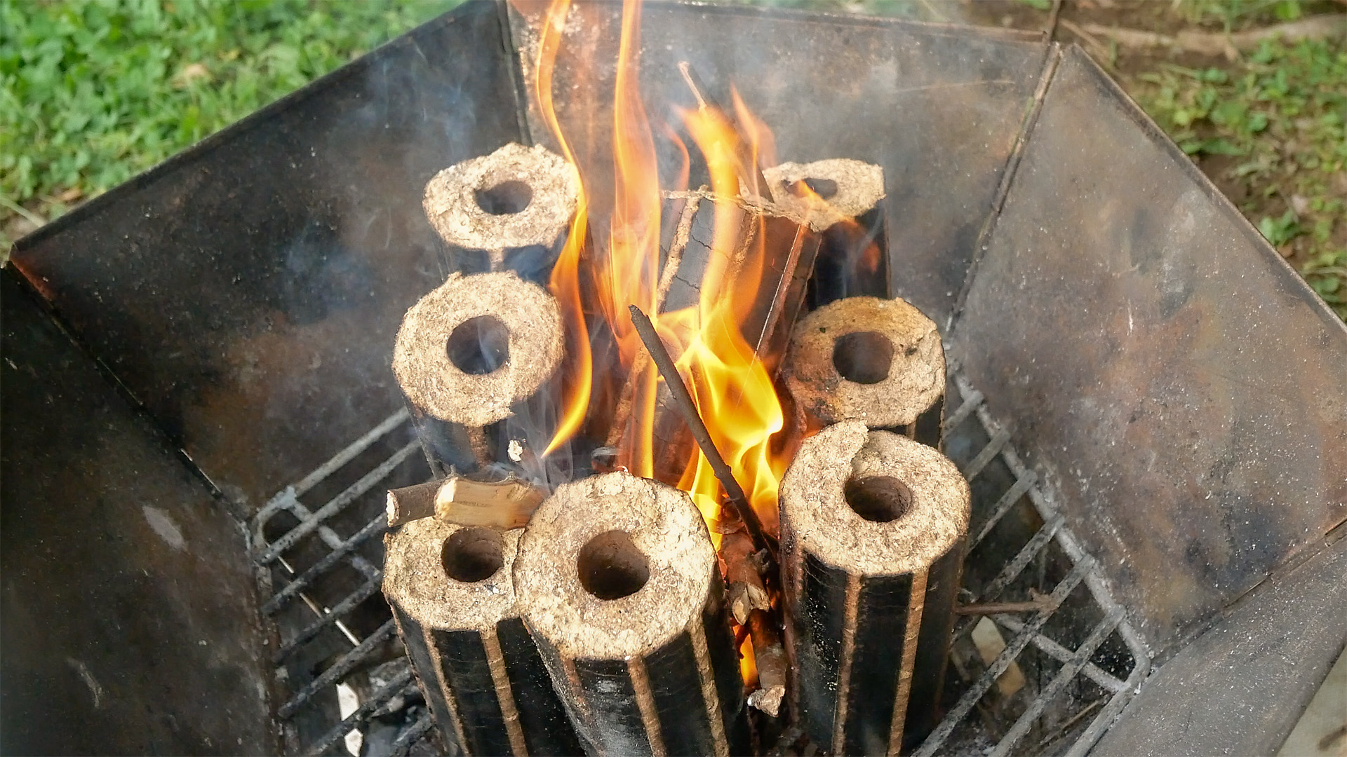 好きな長さに折って使用でき、密度が高いので薪に比べて火力も強く火持ちが良い点が特長です。
