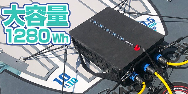 容量1280Wh、IP67の防塵防水仕様のリチウムイオンバッテリーが付属する。低速モードで最大約24時間、最高速モードで約80分の連続航行が可能という。