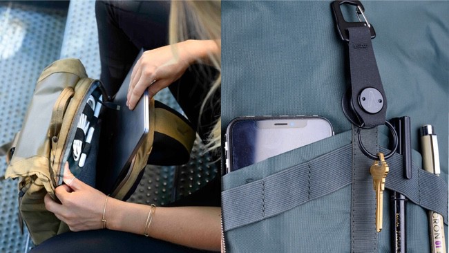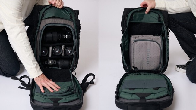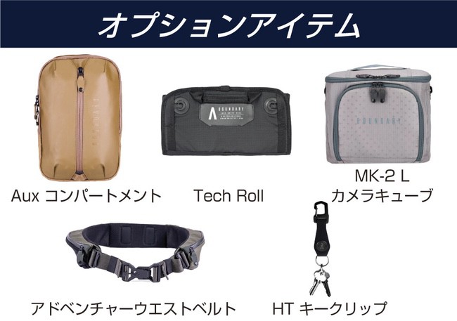 Auxコンパートメントやテックロール、カメラキューブ、ウエストベルトやキークリップなどを使い、内部を仕切ったり、外付けのオプションを付けたりして、整然と収納できる。