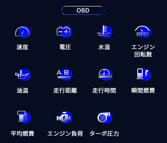 本製品は、そのOBD2のデータを利用する。OBD2モードを起動させると以下の画像にある11項目がパネルで確認できるようになる。