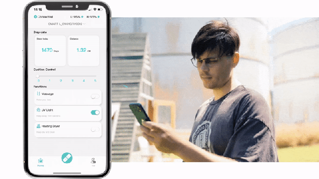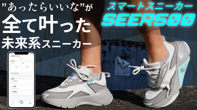 「SEER500」は、エアクッションの調整、足ツボ刺激機能、UV脱臭、加熱乾燥、歩数計の機能を備えたスマートスニーカーだ。