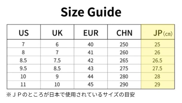 ブラックとグレーの2種類展開。サイズ26.5cmでスニーカーの重さは約1.1kg。サイズ表は以下の通りだ。