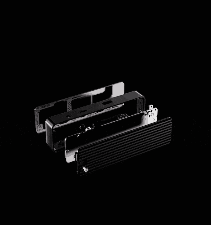 外観は、ディプレイ側に内部の構造がわかるスケトンデザインを採用。その反対側はアルミニウム合金のヒートシンクを備えたカバーになっている。