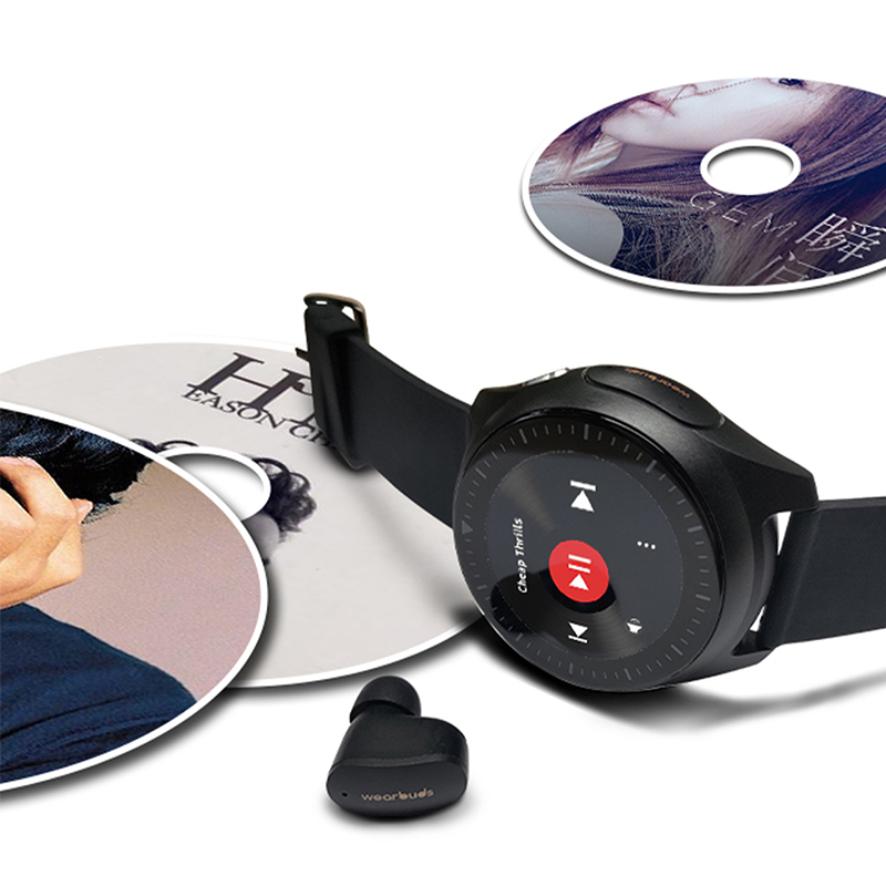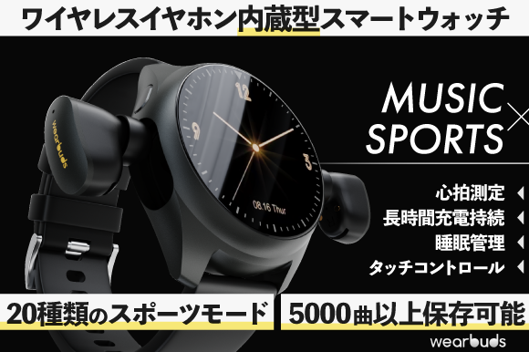 「Wearbuds Watch」の最大の特徴は、イヤホンを収納できるデザイン。収納している間に充電も可能だ。イヤホンの連続再生時間は最大3時間で、1時間でフル充電できる。