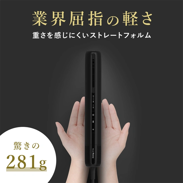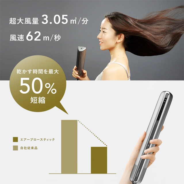「エアーブロースティック」は持ち手と本体が一体型のスティック形状設計になっている。手にしたところに駆動分があり、髪を乾かすためにドライヤーを動かしても負担になりにくいはずだ。重さは281g。スティック形状なので収納もしやすい。