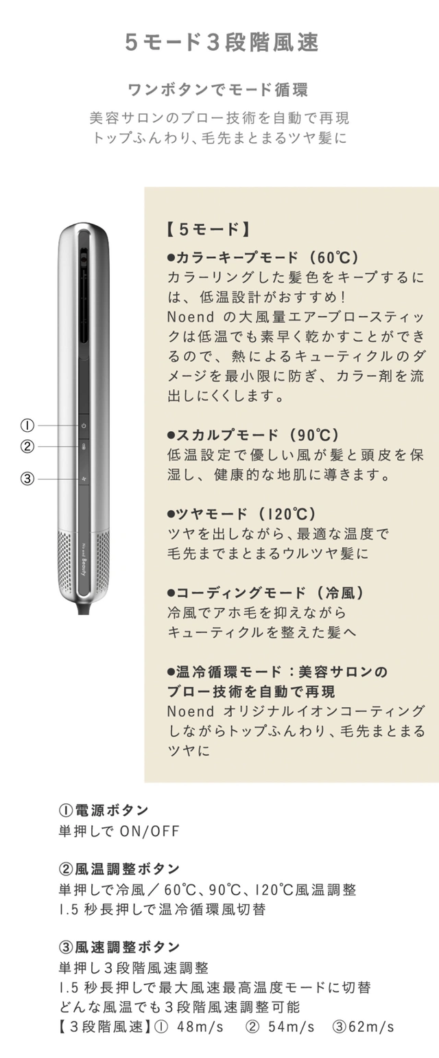冷風(コーディングモード)・60℃(カラーキープモード)・90℃(スカルプモード)・120℃(ツヤモード)の4段階。1.5秒長押しすると温冷循環モードに切り替わる。