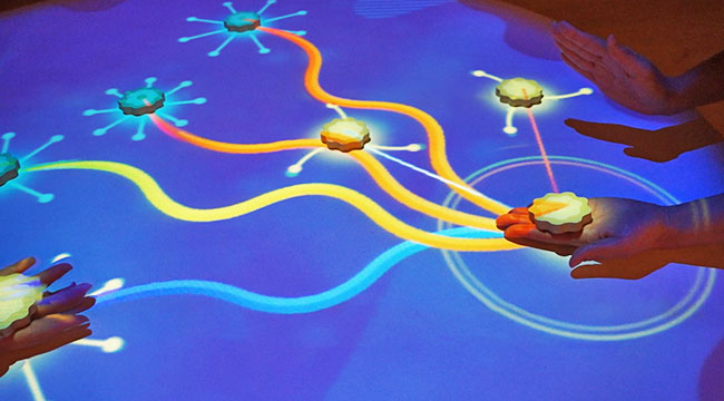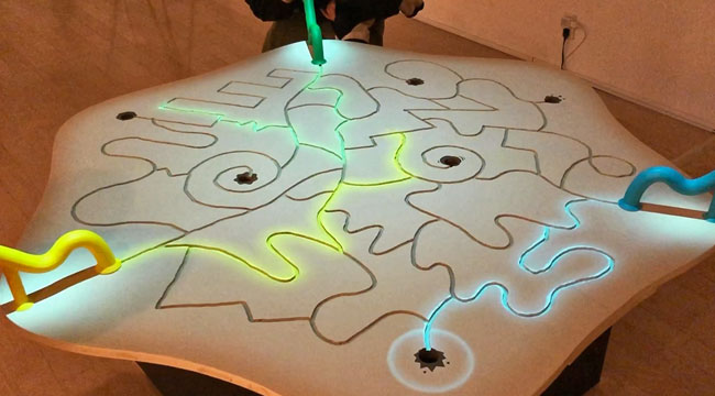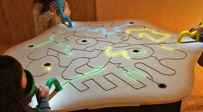 もう一つの展示は、吹き込んだ声が、光のラインとなってテーブル上の道を駆けまわる「ユクエオン」です。