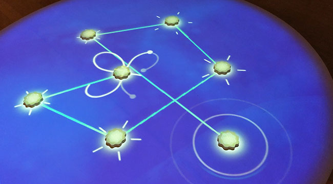 パネルの表と裏を検知して、光の色が変化します。全部を表か裏に統一すると、光の結び方のアニメーションが変化するという隠れた仕掛けも。