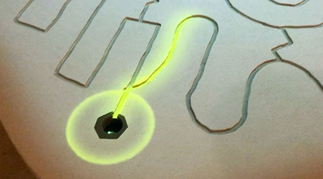 テーブル上の道は、電動の切削工具で溝を掘っています。プロジェクションマッピングで溝にラインの映像を合わせることで、平面に映像投影するだけでは出せない光の立体感を演出しています。