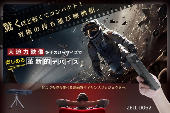 「IZELL-D062」は、片手で持ち運べるコンパクトなプロジェクターだ。