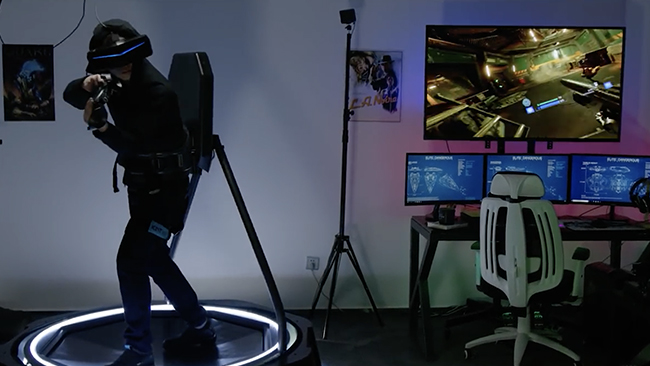 「KAT WALK mini S」では、歩くだけでなく、走る・しゃがむ・ジャンプする等の動作も可能。足元の振動フィードバックで爆発・地震などの感覚が得られ、没入感が高まるという。