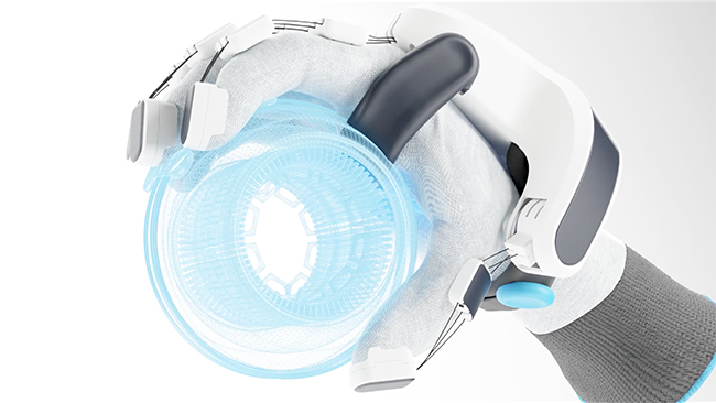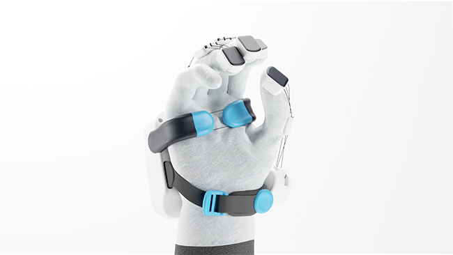 第2世代の「SenseGlove Nova 2」は、さらに手のひらにも触覚フィードバック機能を搭載。そこに指の動きを制限する機能も連動し、例えばリンゴを握ったり絞ったりする感覚や、人と握手する感覚なども再現できるという。