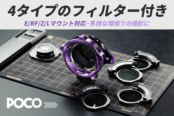 「POCO」は映像撮影のために開発されたフィルターアダプター。ワンボタンでフィルターを交換できるのが特徴だ。また様々な直径サイズのPLレンズに対応し、フィルターを装着したままレンズ交換が可能なので、撮影時に便利だ。