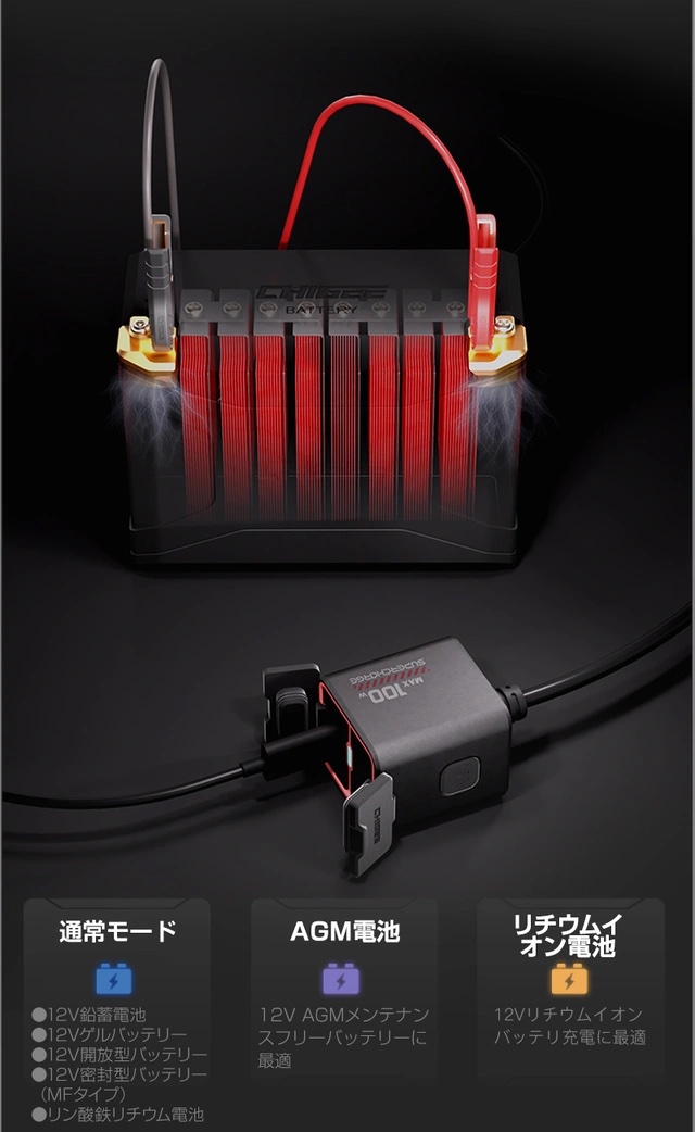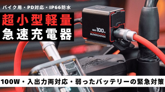 急速充電が可能なUSB PD(Power Delivery)対応。双方向から電力供給でき、バイクのバッテリーと繋いだTR100/TR65からスマホなどの電子機器を充電できる。またモバイルバッテリーやACアダプターに接続したTR100/TR65から、衰弱したバイクバッテリーに緊急充電も可能だ。
