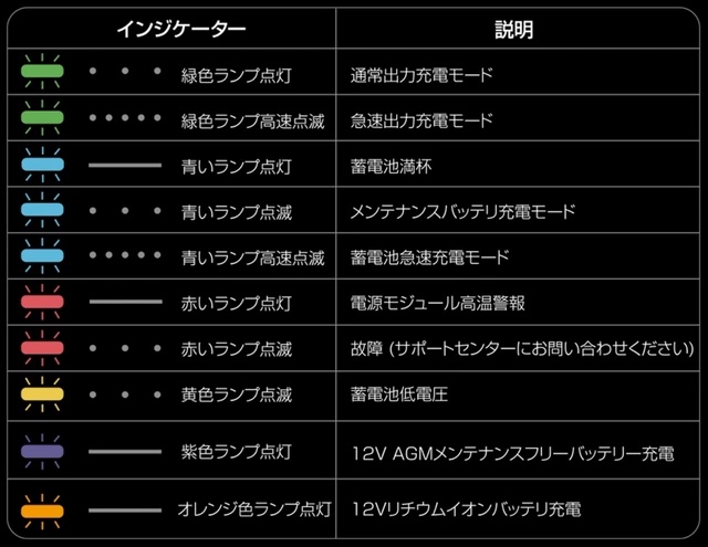 充電状態は本体についたLEDランプで確認できる。ランプパターンと意味は以下の通り。