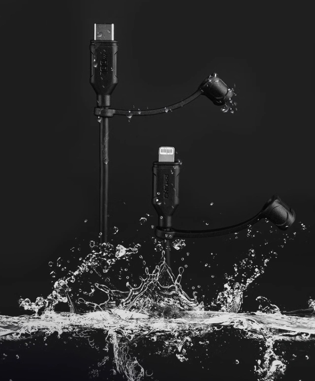 ボディはアルミニウム合金製。IP66の防水防塵。付属で防水仕様の100Wの高速充電に対応したUSB Type-CとLightning充電コードがついている。