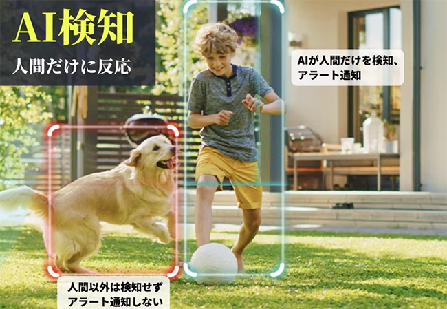この防犯カメラは、AIが人間のみを検知する「人間検知モード」を搭載。揺れる草木や動物などには反応せず、人間を検知した際だけスマホアプリへ通知する。人間以外の検知したい場合はモードを切ればOKだ。