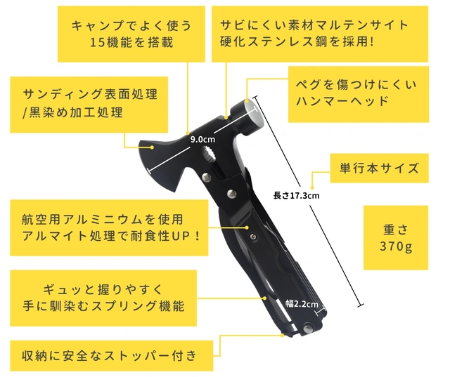 【15の機能を搭載】キャンプやDIYで必須の機能を完備 【サビにくいから長持ちする】耐食性、耐久性に優れるステンレス鋼を採用 【デザインもおしゃれ】高級感溢れるマットブラックで気分も上がる