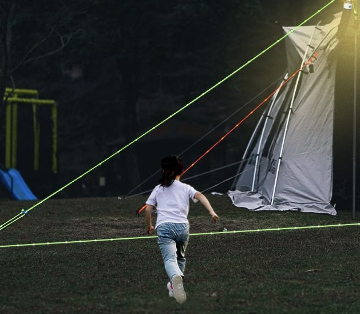 キャンプでテントやタープを張る際に使うロープ。夜間はロープが見えづらく引っかかってしまうこともある。