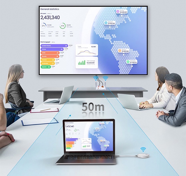 伝送距離は最大50m。大きなホールなどでも利用できる。テレビなどのスピーカー搭載機器であれば、音声も飛ばせる。