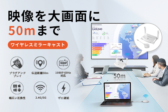 「ワイヤレスミラーキャスト」はプラグアンドプレイでミラーリングが可能。出力の解像度は1080pのフルHD。リフレッシュレートは60Hz。2.4GHz+5GHz複数の周波数帯域を同時に使用して、遅延はほぼゼロだという。