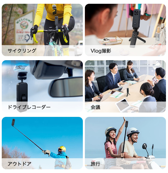 また、三脚穴で固定してサイクリングやドライブレコーダーなどの使い方も示されている。ただし、手ブレ補正機能の有無については記載が無いようだ。