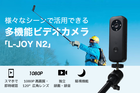 「L-JOY N2」は、1080pの画質で気軽に動画撮影できるスティック型カメラ。120度の広角撮影に対応する。