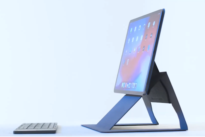 iPadの画面を約8.5cm持ち上げ、視線を上げたアングル(70°)で固定できる。iPadをパソコンとつなげれば、デュアルモニターに早変わり。
