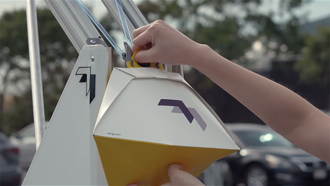 「Wing」の配送サービスでは、まず空中でホバリングするドローンから下へ向かってケーブルが垂らされ、小売店スタッフがケーブルの先に荷物を引っ掛ける。