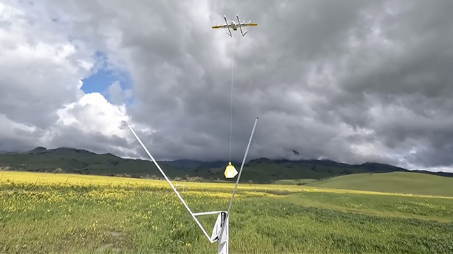 すると機体がケーブルを巻き取って荷物を回収。最高時速約104kmで水平飛行し、目的地上空に到着すると、再び機体からケーブルを垂らして荷物を地面に置くしくみだ。