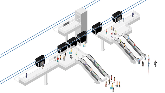 駅では、動き続けるゴンドラに待ち時間なしで乗車できるレーンと、止まった状態で乗車できるレーンの2パターンを設置可能。1つの駅に両方のレーンを設けることもできる。