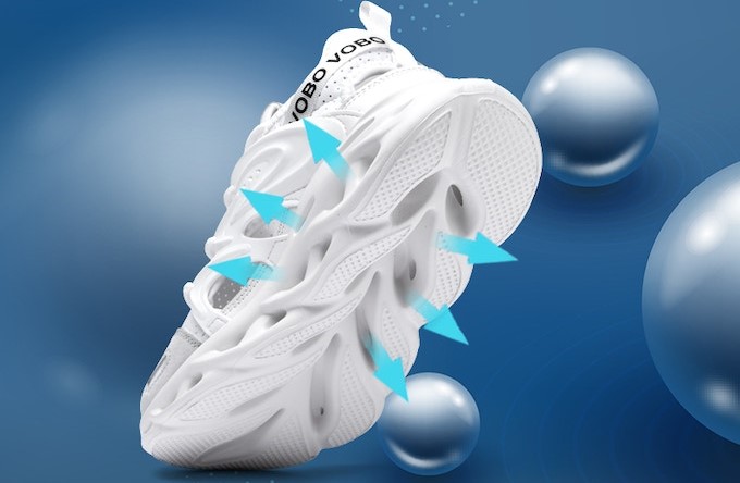 ソールの高さは5cmで、通気性と耐衝撃性を兼ね備えた特徴的なデザイン。歩くことで靴底の空気が内部に絞り出される構造で、外気と内部の空気が循環し、涼しく快適に保てるのだという。